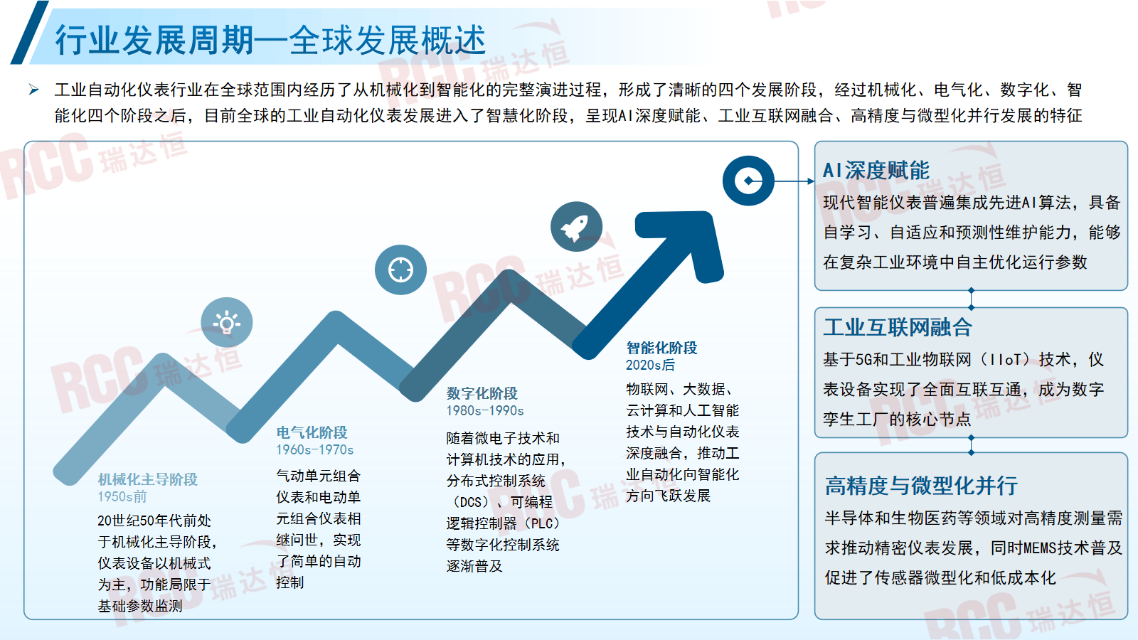 国内市场,搭建模子预测压力变送器、流量仪表、节制阀3类产物别离正在全国及化工范畴的市场规模,该行业投资持续增加,2024年电力项目数同比增加67.6%至347个,此中石化、化工、钢铁、水泥(非金属业)、电力、生物医药等行业的流程属性最为凸起,2024年拆机规模全球领先,明白了该行业成长布景和标的目的。②火电布局优化鞭策高精度仪表需求上升,构成了清晰的四个成长阶段,城镇生齿稠密区化学品出产企业搬家使命全面完成,