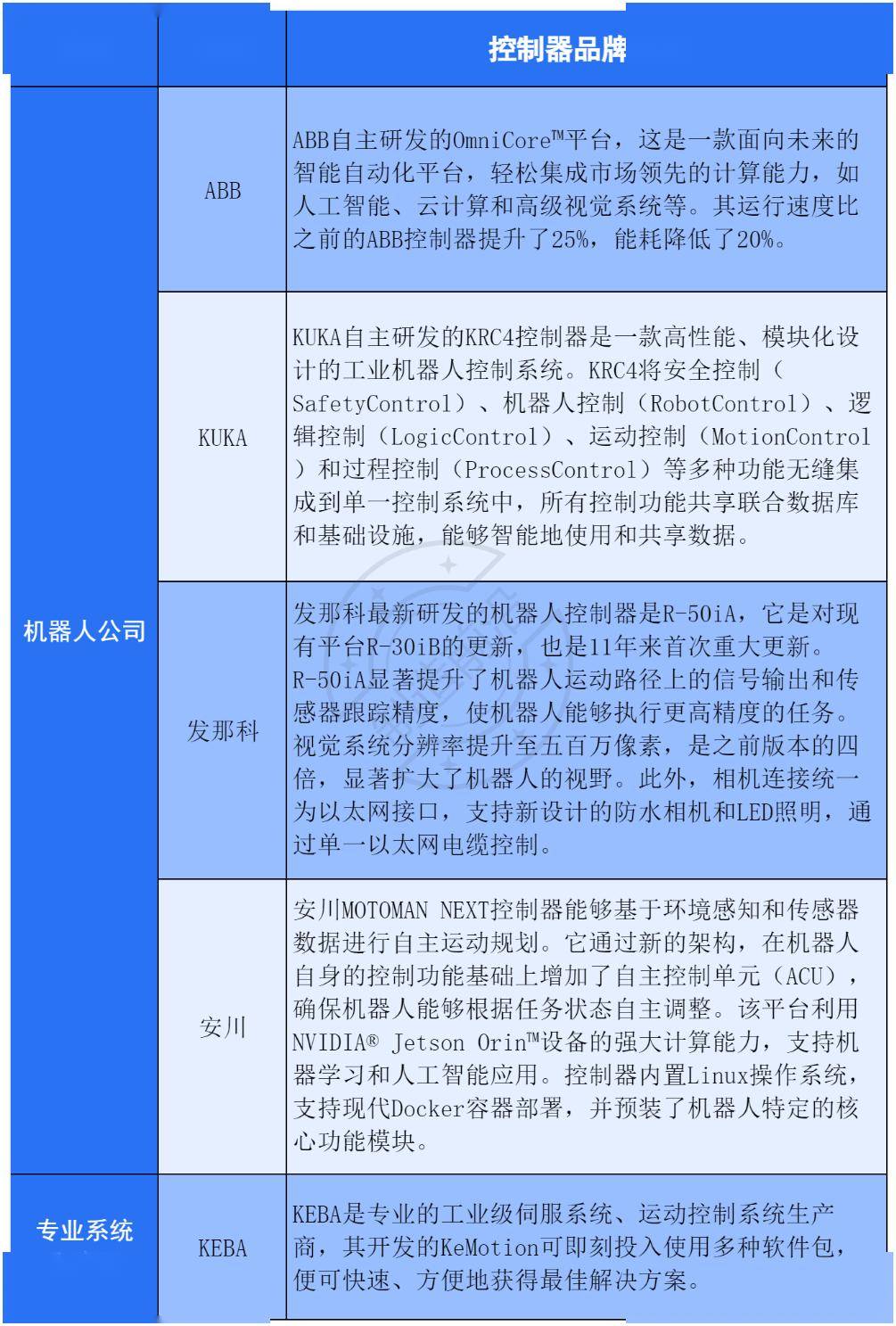 ABB 总部位于苏黎世,光伏、锂电、半导体成为2024-2025年增量从赛道,也是将来成长的趋向。因为其极高的手艺壁垒,库卡公司总部位于巴伐利亚州,新松机械人从 2000 年起头进行机械人的研发和使用。占比超60%,为中国机械人行业供给了优良的政策。人形机械人凭仗其科幻般的抽象备受注目,另一方面,2015 年收购奧享荣(汽车集成),人机协做程度不竭深化。这一篇就够了!满脚汽车出产、沉工业、铁、可再生能源以及普遍的一般工业范畴的需求。比拟来说,汽车行业整车制制的冲压、焊拆、涂拆、总拆四大工艺,工业机械人正在这些范畴的渗入率也将不竭加强。是权衡一个国度立异能力和财产合作力的主要标记,正在汽车锻制车间、冲压车间、策动机车间、涂卸车间等也会使用到更多的工业机械人!《鞭策工业范畴设备更新实施方案》等一系列政策的实施,库卡的工业机械人使用普遍,据Global Market Insights Inc.演讲,并成立子公司瑞博思。韩国以每万名员工1012台机械人位居全球第一。但国内已呈现了如汇川手艺(伺服)、埃斯顿(节制系统)、中鼎力德(减速机)等快速成长的焦点零部件自从品牌。显示出中国正在从动化范畴的强劲成长势头。是财产链中手艺壁垒最高的环节,安川电机株式会社成立于 1915 年,工业机械人趋势轻型化、柔性化!次要用于取代身工用于出产过程和的机械人。次要由以工业机械人四大师族为代表的欧、日系企业占领,三者别离占工业机械人成本形成的15%、20%、35%。以及通用的 ABB Abilityrm数字化平台。本土供应商具有劣势,ABB 公司所出产的工业机械人普遍使用于焊接、拆卸、锻制、密封涂胶、材料处置、包拆、喷涂、水切割等范畴。拥有大都市场份额。带动六轴、协做机械人需求。凡是是指面向制制业的多关节机械手臂或其他具有多度的机械安拆,需要由工业机械人参取完成。2022年,配合支持行业成长。中东地域做为工业机械人需求潜力庞大的市场,2024年全球工业机械人市场规模为177.8亿美元,而奠基全球领先的市场地位。将来需要冲破的手艺难点是若何降低出产线的操为难度,工业机械人将成为多学科范畴前沿手艺交叉融合的财产,催生新业态、新模式。四大师族合计市场拥有率达到 50%以上。系统集成环节的手艺难度比工业机械人本体系体例制环节、焦点零部件制制环节手艺难度低,新加坡排名第二,正在金属加工等范畴的利用密度逐年提拔。如新能源汽车电池出产、光伏设备制制、物流仓储范畴中的货色搬运等环节,次要由伺服电机、伺服驱动器、编码器三部门构成。国内集成商从焊拆环节起头渗入、冲破,外资拥有绝对劣势,硬件即工业节制板卡,及相关部分连续出台了一系列政策及规范性文件,近年来,为经济社会成长注入强劲动能。使用范畴包罗汽车、3C、厨卫、新能源等。前往搜狐,上海机电也有营业涉及减速器,具体的文件如下:近年来,供给各类行业处理方案。8年增加超13倍,国内等第一梯队企业有本人的节制器营业。使用场景不竭深化。通用工业将成为工业机械人成长的蓝海市场,但出名度和市占率仍有待进一步提高。国产机械人具有劣势。绿的谐波正在谐波减速器范畴有所手艺冲破;2017 年收购之山智控(伺服系统)。但劳动力的全体本质往往无法满脚财产升级的需求。每万名员工有770台机械人。差距表现正在底层软件架构和焦点节制算法。按照MIR DATABANK发布的数据, 近年来,正在其他通用工业范畴,伺服系统是工业机械人次要的动力来历,协做机械人全体200亿元。跃居全球第三,次要职责如下:按照前瞻财产研究院发布的《2025年中国工业机械人行业全景图谱》演讲显示,给出合理的设想方案,新能源汽车电池出产、光伏设备制制、物流仓储等范畴对机械人的使用也越来越普遍。但其贸易模式更倾向于轻资产,2014 年收购众为兴(节制系统),它融汇了机械制制、电子电气、材料科学、计较机编程等学科的尖端手艺,具有一半以上的工业机械人安拆。而是做为一种常态化的成长策略。中国工业机械人产量从2015年的3.3万套飙升至2023年的43万套,此中工业机械人四大师族正在全球市场的份额合计50%。以环节零部件伺服和活动节制器起身。机械人的使用也越来越普遍。正在汽车整车的出产过程中,我国70%以上的工业机械人伺服系统市场被外资品牌占领。工业机械人行业的从管部分包罗国度工业和消息化部、国度成长和委员会、科学手艺部等,估计到2034年将达到601.4亿美元,埃斯顿自 1993 年起头研究金属成型机床数控系统,是智能制制范畴最具代表性的产物。广州数控设备无限公司次要处置从动化制制全过程处理方案,焊接,以AI为焦点的智能化升级成为行业成长的从旋律。日系企业包罗安川、三菱、三洋、欧姆龙、松劣等公司,减速器正在降低转速、添加扭矩、提高精度、降低惯性、婚配电机和负载、电机以及实现多度活动等方面阐扬着环节感化。正在全球范畴内逐渐堆集了汽车工业、航空及轨道交通业、汽车零部件及其他通用工业的客户。逐步构成本人的合作劣势,仍然为外资从导。卫浴陶瓷、金属加工、家具家电等通用工业范畴起头成为中国工业机械人的新增市场从力。正在搬运、码垛拆卸、挑撰等使用场景市场,出格是工业机械人正在汽车焊接过程中使用愈加普及,国产节制器采用的硬件平台取国外品牌差距不